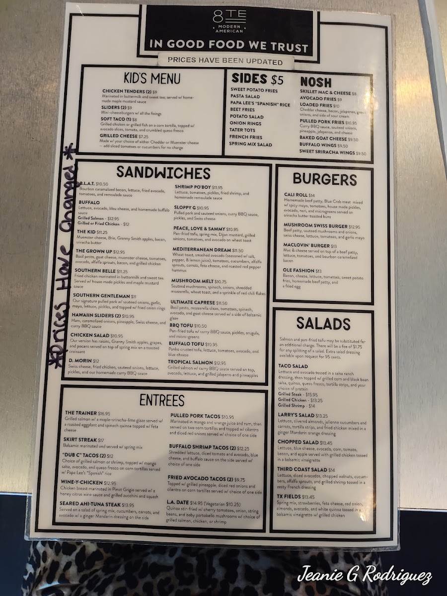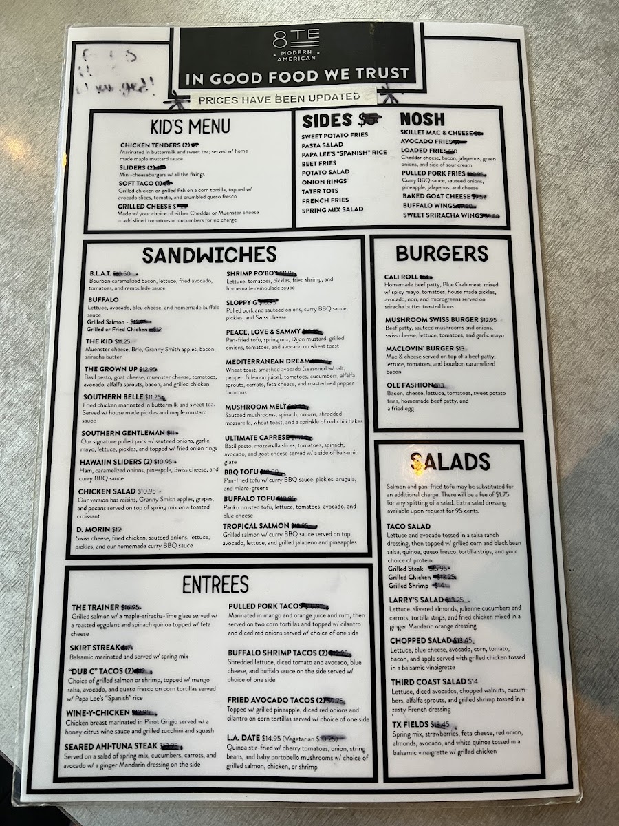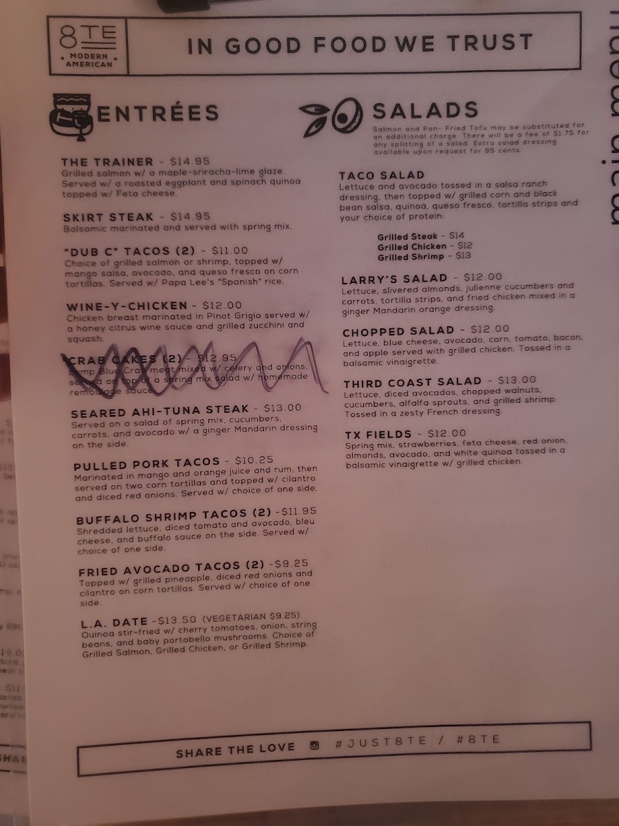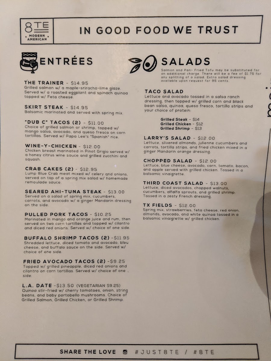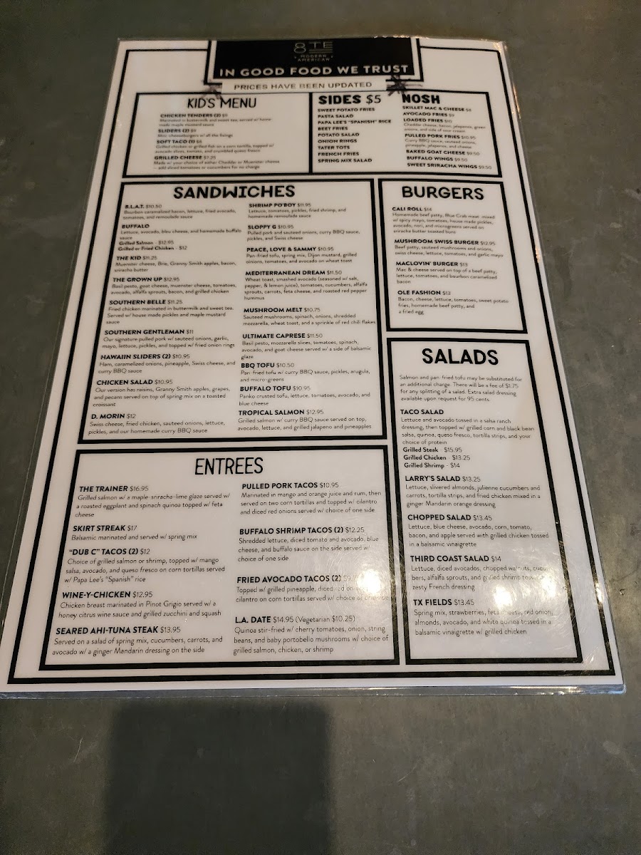 The menu at 8TE - TX 78412 offers a variety of American-style dishes suitable for lunch and casual dining occasions. The food selection is organized into several categories, including salads, sandwiches, and entrées, providing options for different preferences and dietary needs.
