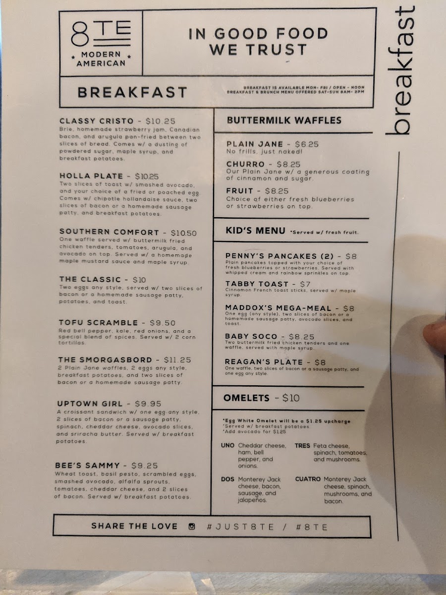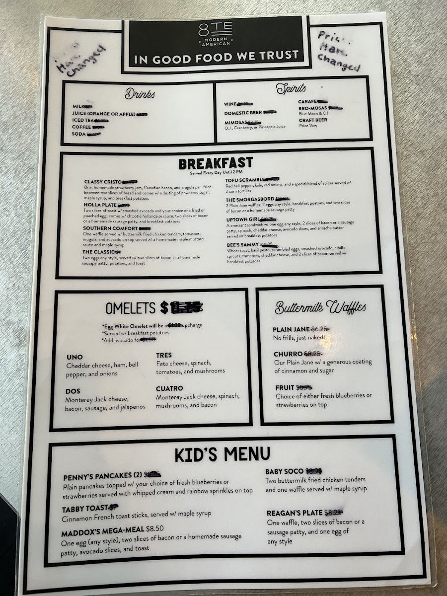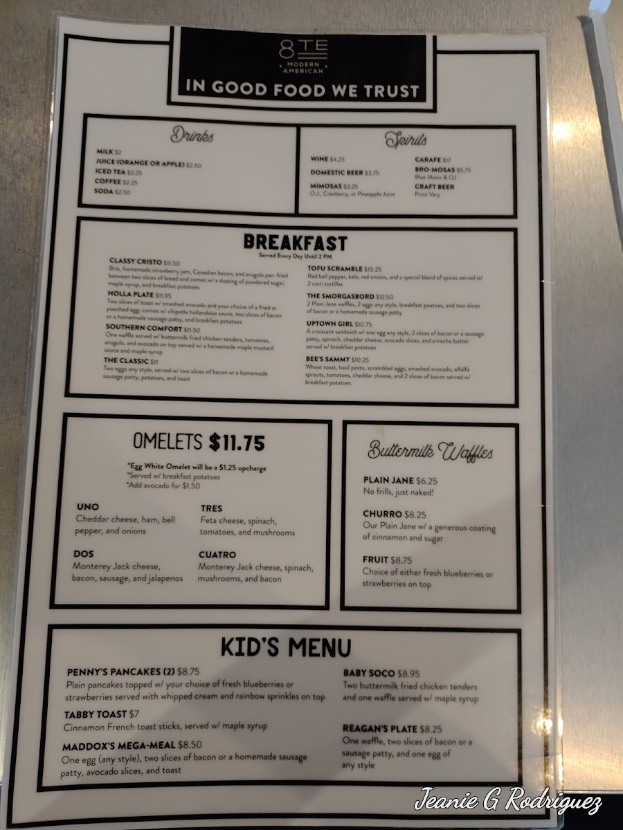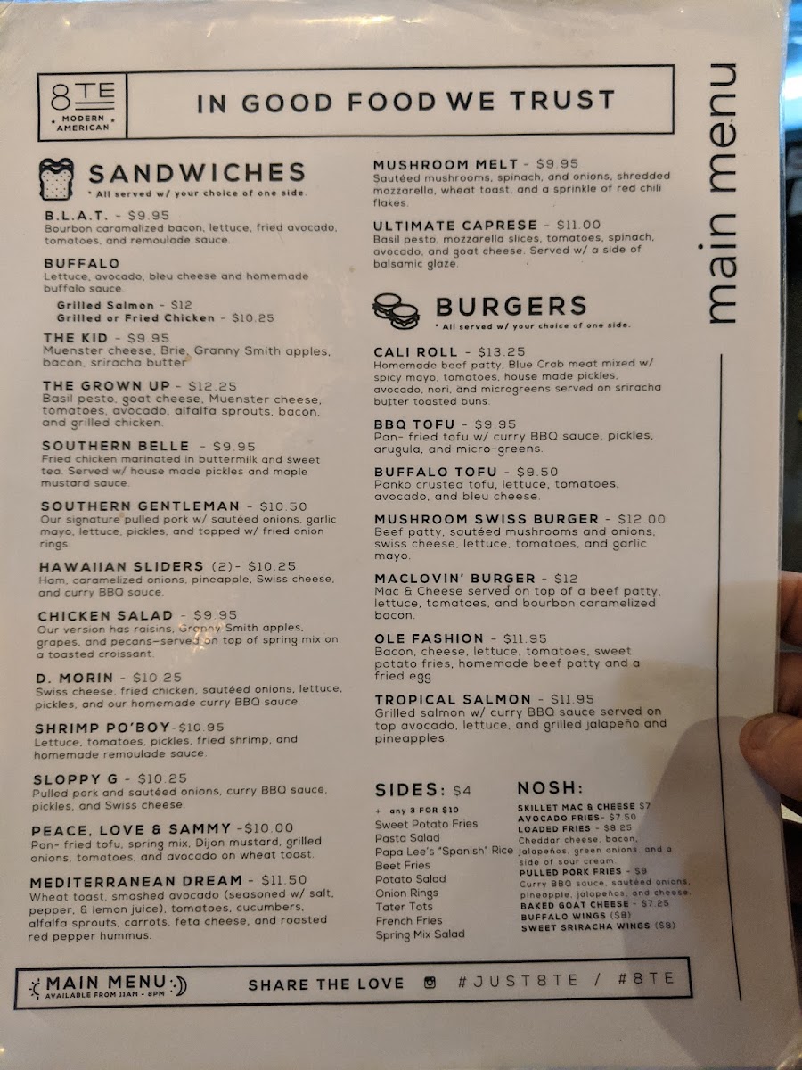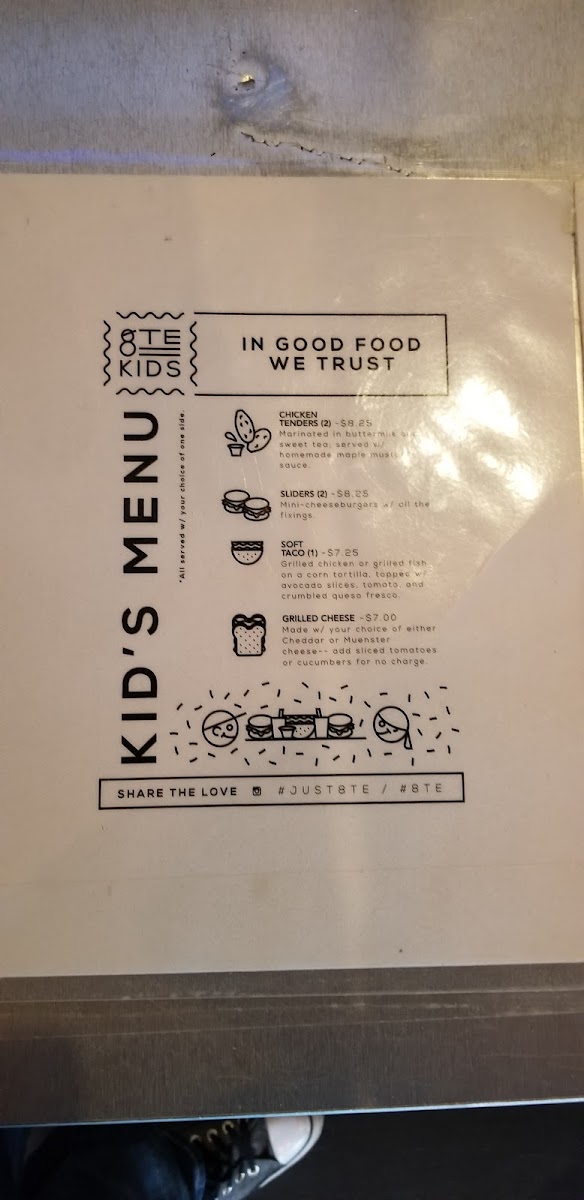 The menu at 8TE - TX 78412 offers a variety of American-style dishes suitable for lunch and casual dining occasions. The food selection is organized into several categories, including salads, sandwiches, and entrées, providing options for different preferences and dietary needs.